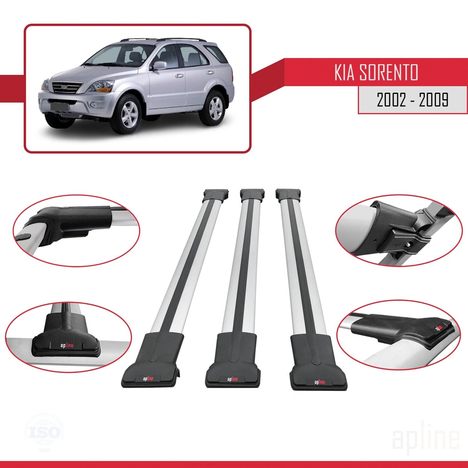 Compatible avec Kia Sorento (BL) 2002-2009 FLY Model Barres de Toit Railing Porte-Bagages de Voiture Gris Aluminium 3 Barres