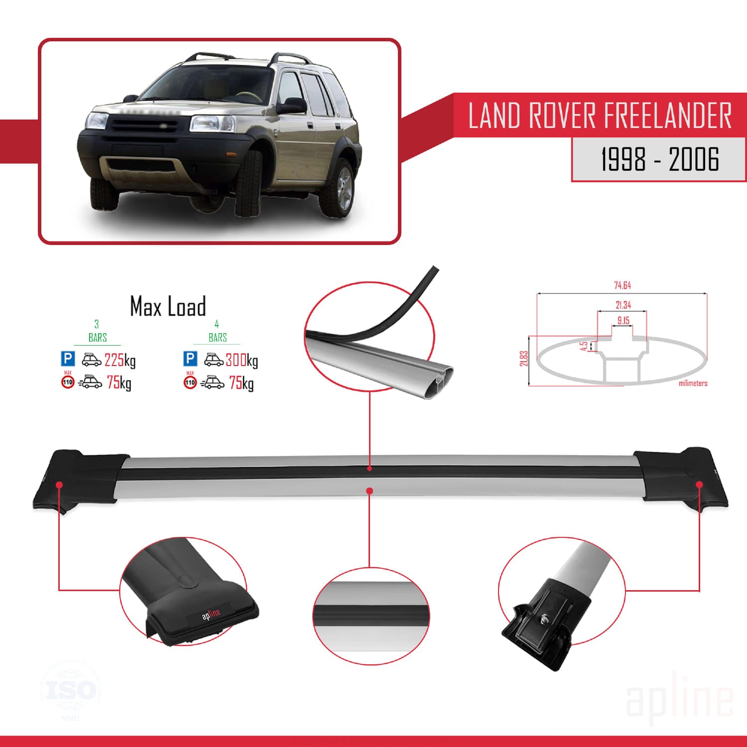Compatible with Land Rover Freelander (L314) 1998-2006 FLY Model Car Roof Rack Cross Bar Grey Aluminium 3 Bars