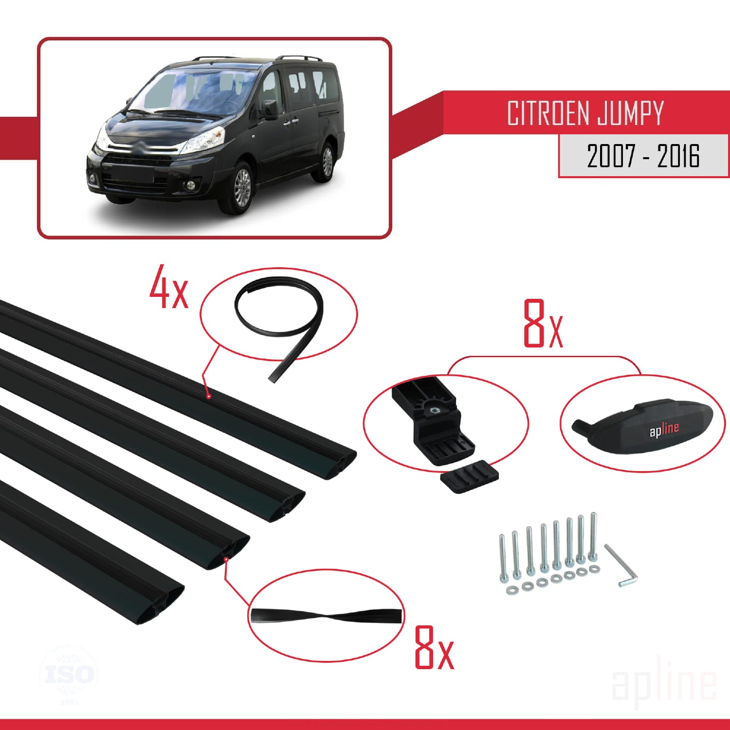 Compatible avec Citroen Jumpy 2 (G9) 2007-2016 BASIC Model Barres de Toit Railing Porte-Bagages de Voiture Noir Aluminium 4 Barres