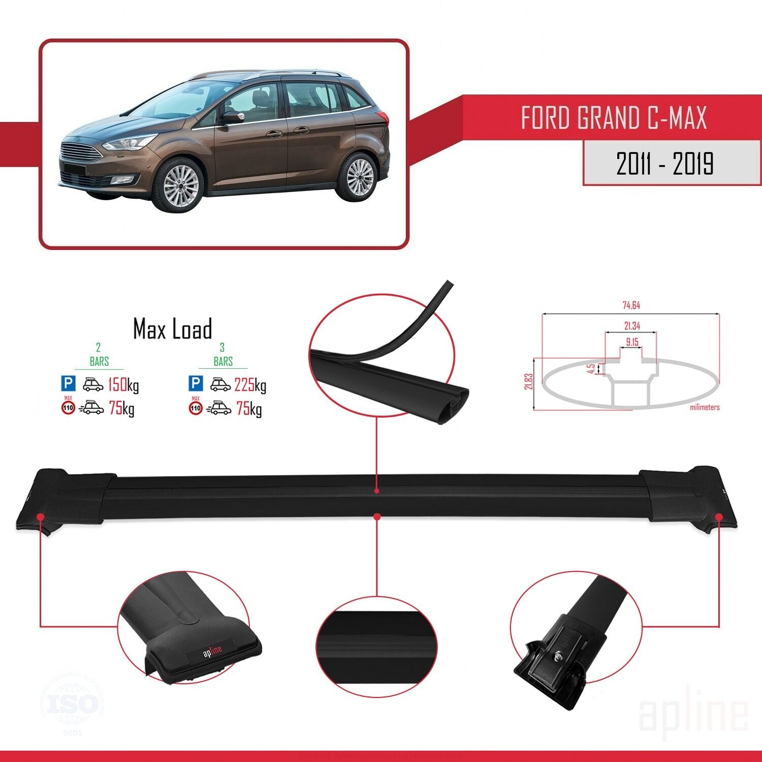 Compatible avec Ford Grand C-Max (C344) 2011-2019 FLY Model Barres de Toit Railing Porte-Bagages de Voiture Noir Aluminium 2 Barres