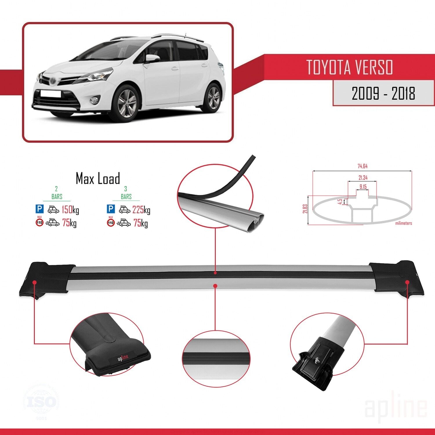 Compatible avec Toyota Verso (AR20) 2009-2018 FLY Model Barres de Toit Railing Porte-Bagages de Voiture Gris Aluminium 2 Barres